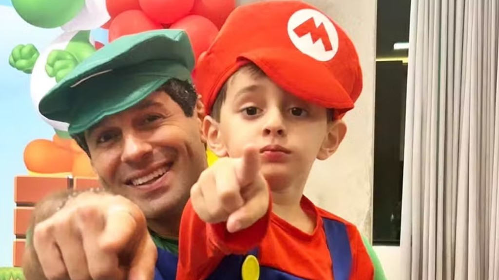 João Baldasserini e a esposa, Érica, comemoraram o aniversário de 5 anos do filho, Heleno, com uma festa temática inspirada nos games de Mario Bros. Para a