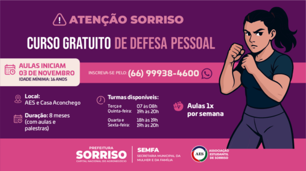 Estão abertas as vagas para mulheres interessadas em participar de um curso especial de Defesa Pessoal. Ofertado em parceria pela Prefeitura, por meio da Secretaria da Mulher e da Família (Semfa), Delegacia da Mulher e Associação Estudantil de Sorriso (AES), o curso é gratuito e voltado especificamente para mulheres acima de 16 anos.