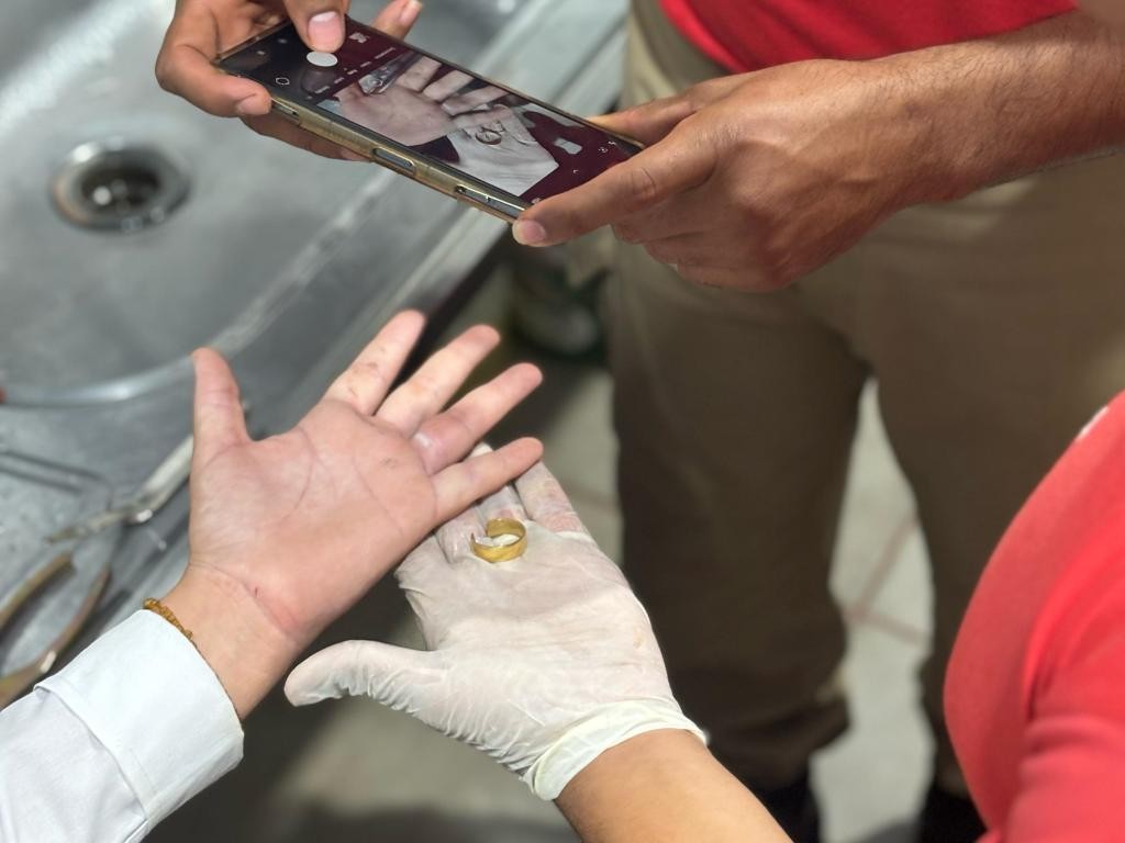 A vítima compareceu pessoalmente a um dos quartéis dos bombeiros, relatando que o anel preso estava causando desconforto e apresentava risco de comprometimento circulatório.