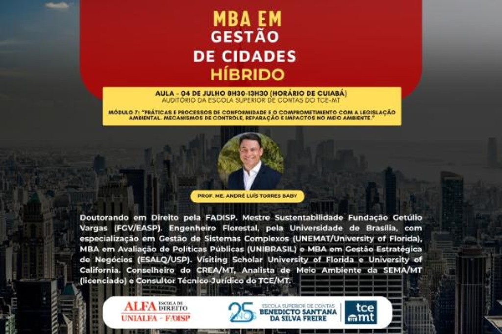 Práticas e processos de conformidade, o comprometimento com a legislação ambiental e os mecanismos de controle, reparação e impactos no meio ambiente serão abordados no 7° módulo do MBA em Gestão de Cidades do Tribunal de Contas de Mato Grosso (TCE-MT), que será realizado nesta sexta-feira (4), a partir das 8h30.