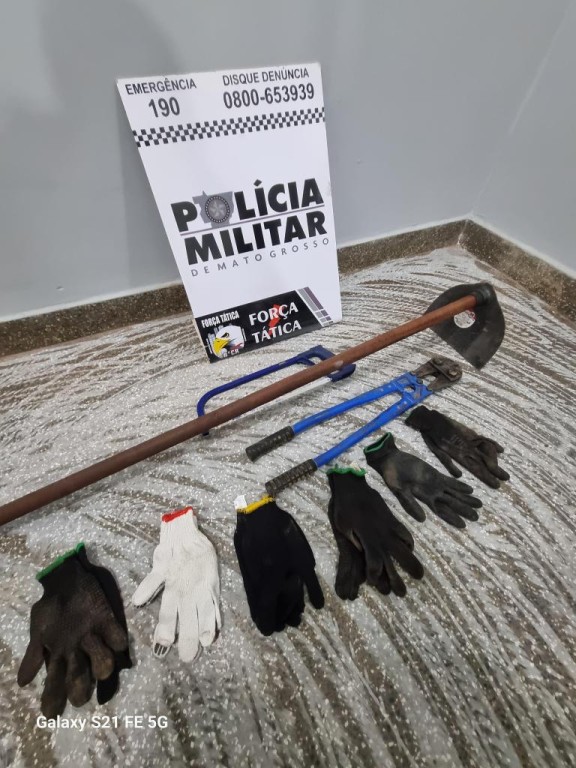 Os policiais seguiram para o local e flagraram os suspeitos em direção a rodovia MT-070 e fizeram abordagem. Em verificação ao caminhão, foi constatado a presença de grande quantidade de fios de cobre, além de ferramentas de corte e cinco pares de luvas.