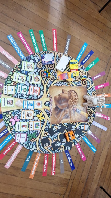 #Paratodosverem – Esta matéria possui recursos de texto alternativo para promover a inclusão das pessoas com deficiência visual. Descrição: Imagem 1: foto colorida mostra a imagem redonda, grande, da árvore da vida sobreposta com a imagem de um cérebro sendo apagado com uma borracha. Em volta da imagem estão dezenas de papeletas com palavras como tolerância, paciência, lealdade, confiança, e uma girafinha de pelúcia, símbolo da Justiça Restaurativa. Imagem 2: imagem panorâmica mostra pessoas sentadas em cadeiras escolares, numa sala ampla e iluminada. Aparecem nove pessoas na foto. Elas estão sentadas em círculo, em volta da imagem descrita anteriormente. Imagem 3: Foto panorâmica de um grupo de cerca de 20 pessoas. Todas sorriem e olham para a câmera. Elas estão num lugar externo e podem-se ver vasos de plantas suspensos. Algumas seguram um banner grande, azul, onde se lê V Mutirão Cuida de Mim – quem cuida de quem cuida. Sejam bem-vindos”.