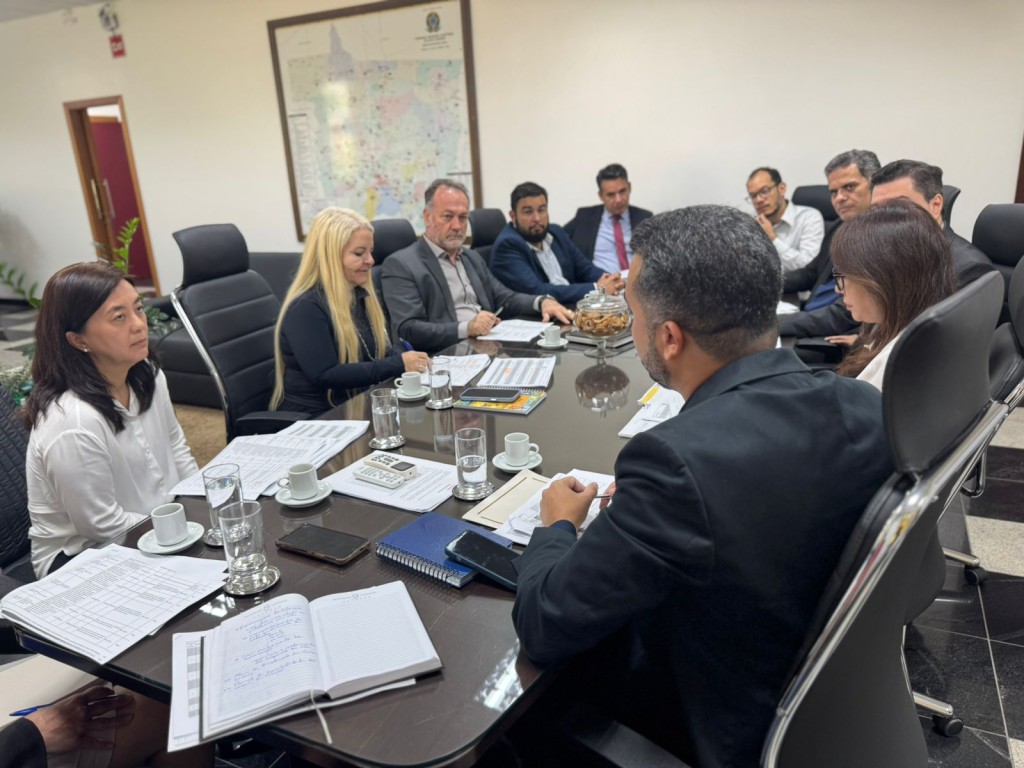#descriçãodaimagem: Reunião na Presidência do TRE-MT. Mesa com a presidente ao centro, desembargadora Serly Marcondes, secrtários e assessores nas demais posições.