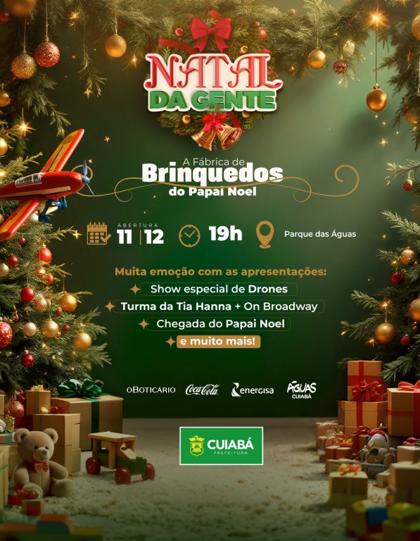 Durante o lançamento, o público poderá prestigiar, como atração principal, um incrível show de drones, que promete encantar a todos com figuras natalinas projetadas sobre as águas do Parque das Águas. A abertura da edição natalina será marcada por uma exibição especial e cheia de magia. Com o mesmo equipamento utilizado nos shows da Disney, o espetáculo apresenta imagens inesquecíveis: uma árvore de Natal gigante que se transforma em uma garrafa clássica da Coca-Cola, um Papai Noel de 100 metros de altura, o icônico caminhão de Natal e, claro, uma homenagem especial à cidade de Cuiabá. É uma experiência única, que promete emocionar e marcar a cidade para sempre.