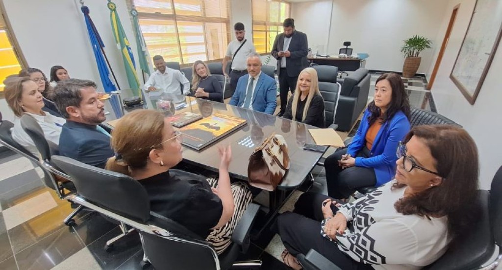#PraTodosVerem – A imagem mostra uma reunião institucional comandada pela desembargadora Serly Marcondes Alves, presidente do TRE-MT, e pela vereadora Paula Calil, presidente da Câmara Municipal de Cuiabá, com participação de suas respectivas equipes. Elas estão sentadas em torno de uma mesa de vidro. Ao fundo, aparecem bandeiras do Brasil e de Mato Grosso, reforçando o ambiente oficial. Os participantes, entre homens e mulheres, parecem atentos à fala de uma das integrantes, em um momento de diálogo e troca de ideias.