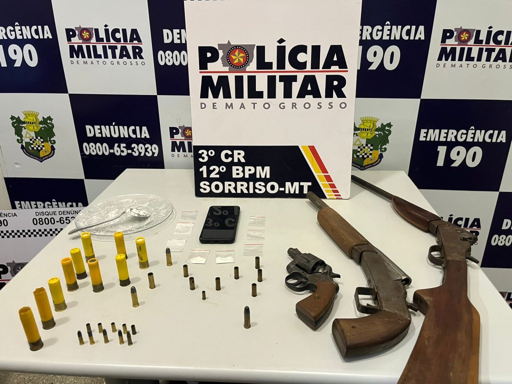 Policiais militares do 12º Batalhão apreenderam, na noite desta terça-feira (01.10), três armas de fogo, 33 munições de diversos calibres e outras porções de substância análoga à cocaína em Ipiranga do Norte (438 km de Cuiabá). Na ação, um homem, de 41 anos, foi preso em flagrante por porte ilegal de armas de fogo e tráfico ilícito de drogas.