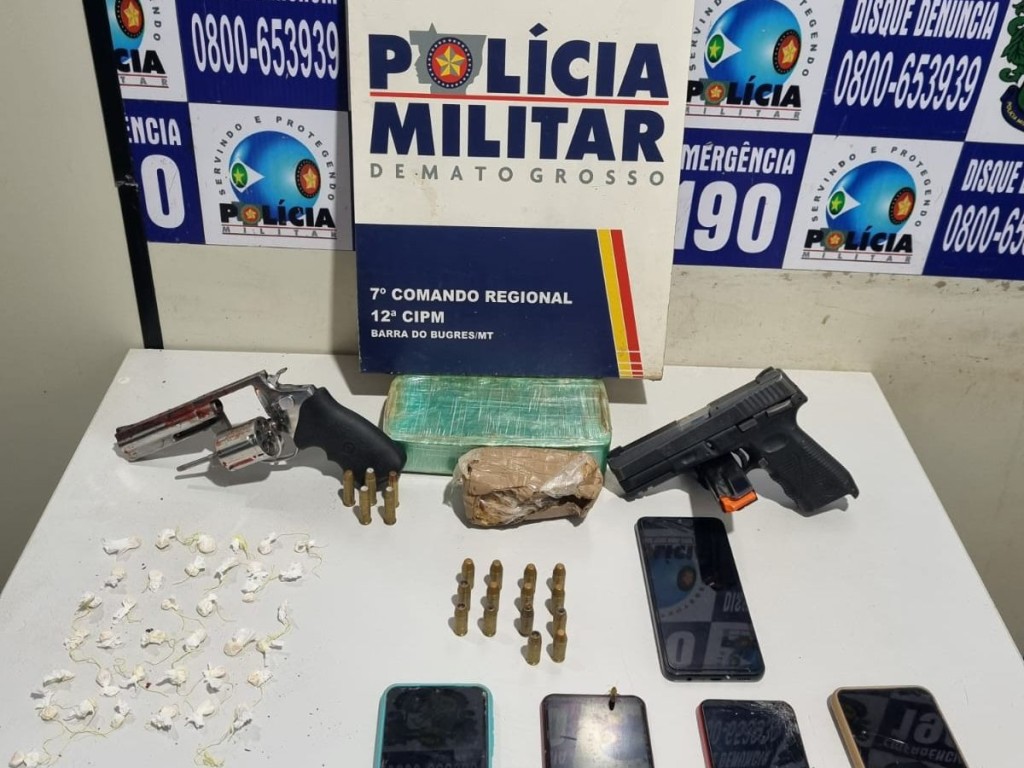 A Polícia Militar prendeu três homens e apreendeu uma adolescente por associação para tráfico de drogas e porte ilegal de arma, no final da noite deste domingo (24.11), em Barra do Bugres. Com os suspeitos, identificados como membros de uma facção criminosa, foram apreendidas armas de fogo, além de um tablete e porções de pasta base de cocaína.