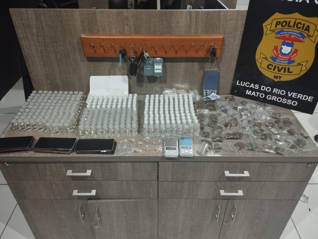 No interior da residência, foi encontrado em cima de uma mesa, grande quantidade de entorpecentes, dentre eles, 324 frascos da mistura conhecida como “loló’, porções de maconha embaladas em saquinhos ziplock, 22 compridos de ecstasy, três balanças de precisão e aparelhos celulares.