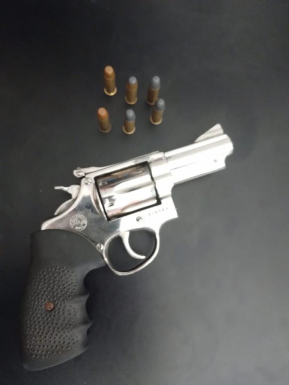 Com eles, os policiais apreenderam um revólver calibre 38, que estava municiado, dois aparelhos celulares e uma porção de substância análoga à maconha.