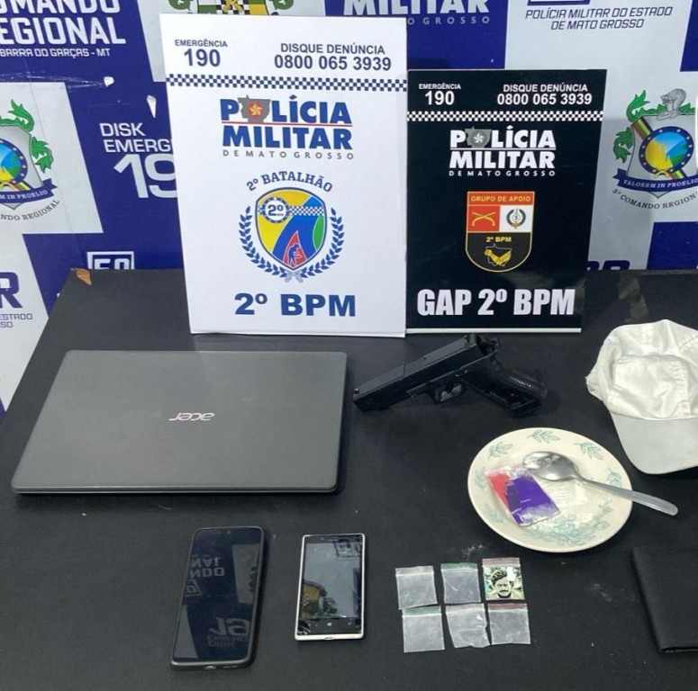 Diante do relato, os militares se deslocaram até a residência do segundo suspeito, onde localizaram o notebook em um dos quartos. No local, também foram encontrados um simulacro de arma de fogo e materiais relacionados ao consumo de entorpecentes.