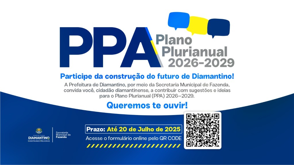 A Prefeitura de Diamantino, por meio da Secretaria Municipal de Fazenda, convida toda comunidade diamantinense a participar da Consulta Pública para a construção do Plano Plurianual (PPA) 2026–2029.