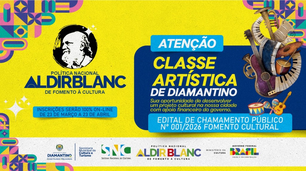 A Prefeitura de Diamantino, por meio da Secretaria Municipal de Cultura e Turismo, tornou público o Edital de Chamamento Público nº 001/2026, destinado à seleção de projetos culturais para firmar o Termo de Execução Cultural com recursos da Política Nacional Aldir Blanc de Fomento à Cultura (PNAB), instituída pela Lei nº 14.399/2022.