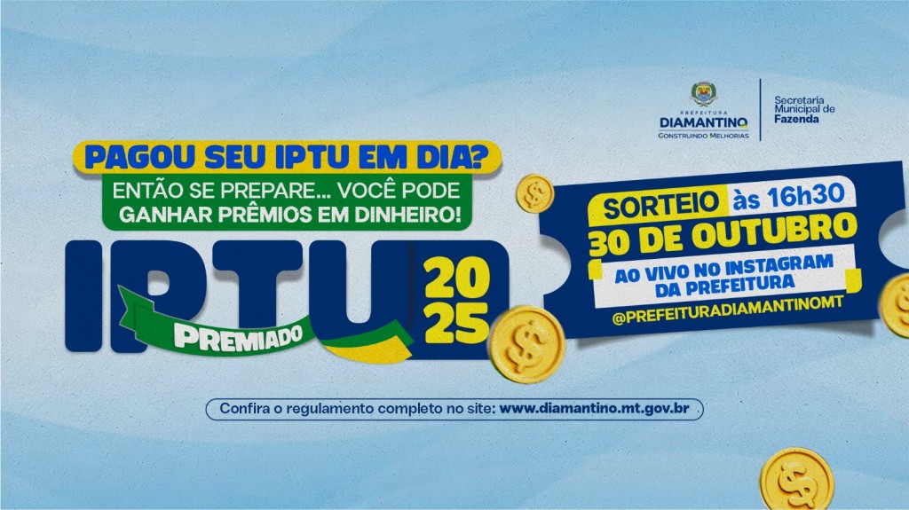 A Prefeitura de Diamantino, por meio da Secretaria Municipal de Fazenda, realiza nesta quinta-feira (30.10), às 16h30, o quarto sorteio do programa IPTU Premiado 2025. O sorteio acontece na sede da Prefeitura e será transmitido ao vivo pelo Instagram oficial do município.