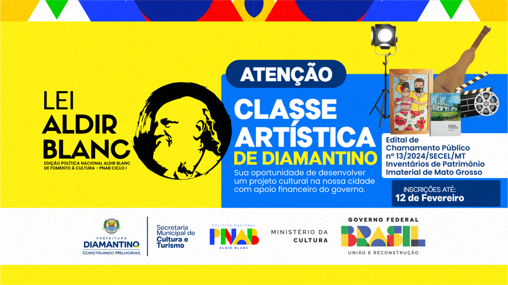 A Prefeitura de Diamantino, por meio da Secretaria Municipal de Cultura e Turismo (SECEL), torna público o Edital de Chamamento Público n° 13/2024/SECEL, referente à Política Nacional de Fomento à Cultura – PNAB, instituída pela Lei nº 14.399/2022, com base na parceria entre a União, os Estados, o Distrito Federal, os Municípios e a sociedade civil no setor cultural.