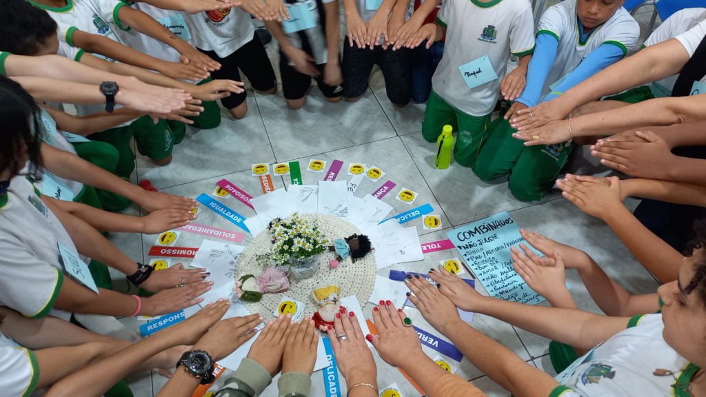 #Paratodosverem. Esta matéria possui recursos de texto alternativo para promover a inclusão das pessoas com deficiência visual. Primeira imagem: foto colorida de alunos da rede municipal de ensino que participaram das atividades do Círculo de Construção de Paz. Eles estão em círculo, com as mãos à frente e, ao centro, estão dispostos objetos que compõem a peça de centro. Segunda imagem: uma mulher segura nas mãos uma tarjeta de papel azul com a palavra sinceridade impressa na cor branca.