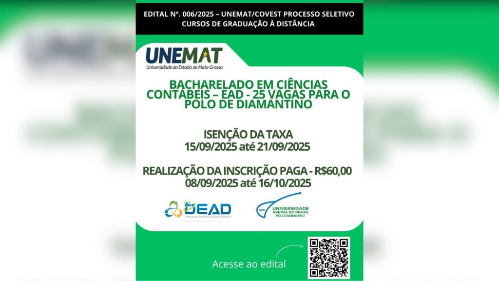 A Universidade Aberta do Brasil – Polo Diamantino, informa à comunidade que estão abertas as inscrições para o processo seletivo, conforme Edital de Abertura nº 006/2025 – UNEMAT/COVEST, destinado ao curso de Bacharelado em Ciências Contábeis.