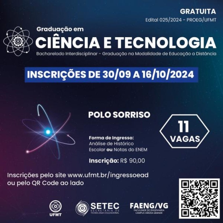 Clique aqui para acessar o Edital_nº_25_2024___PROEG_UFMT___BCT__SETEC.pdf. Os interessados podem se inscrever até 16 de outubro, através do link http://www.ufmt.br/ingressoead.